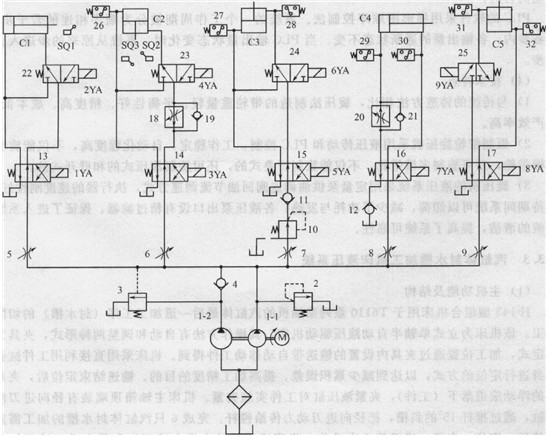 圖2-31所示為該機(jī)床的液壓系統(tǒng)原理圖。系統(tǒng)的執(zhí)行器為輸送液壓缸C1、滑臺液壓缸C2、夾緊液壓缸C3(6個)、進(jìn)刀液壓缸C4、抬起液壓缸c5等5種液壓缸,由于這些缸按順序動作,所以系統(tǒng)采用高低壓雙泵1—1和1 2供油(最高工作壓力由溢流閥2設(shè)定)。當(dāng)各執(zhí)行器輕載快速運(yùn)動時,兩泵同時向系統(tǒng)供油,除進(jìn)刀液壓缸C4外,其余各液壓缸均為用差動連接,差動液壓缸的缸通內(nèi)徑D與活塞桿內(nèi)“徑滿足D一√2d,故可獲得相同的快速進(jìn)退速度;當(dāng)進(jìn)給液壓缸慢速進(jìn)給時,僅由小流量泵1—l供給高壓油,大流量泵2在系統(tǒng)壓力控制下通過卸荷閥3低壓卸荷。缸C1—C5的運(yùn)動方向分別由二位四通電磁換向閥13、14、15、16、17控制;各液壓缸回路的流量分別通過節(jié)流閥5~9調(diào)節(jié);滑臺缸C2慢速運(yùn)動通過調(diào)速閥18回油節(jié)流調(diào)速;進(jìn)刀缸C4的慢速運(yùn)動通過調(diào)速閥20進(jìn)油節(jié)流調(diào)速(回油路設(shè)置的單向閥12,用于提供背壓力,以消除進(jìn)給時的爬行現(xiàn)象,提高切削運(yùn)動的穩(wěn)定性)。輸送缸C1、滑臺缸C2、夾緊缸C3、抬起缸C5的差動快速動作分別通過二位三通電磁換向閥22~25控制。減壓閥10用于嗣整和設(shè)定夾緊缸C3的工作壓力;壓力繼電器26~32分別用于各液壓缸行程到位后的發(fā)信,為了克服過于敏感和安裝方向引起的誤動作,各壓力繼電器均為可以濾除波動壓力的EYX63-4型延時壓力繼電器,以提高系統(tǒng)工作可靠性。
