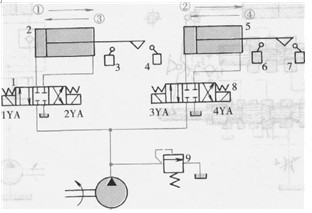 8一換向閥2、5一液壓缸3、4、6、7一行程開關(guān)9-溢流閩