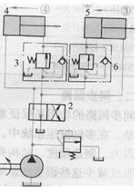 1-溢流閥2一換向閥3、6-順序闊4、5-液壓缸