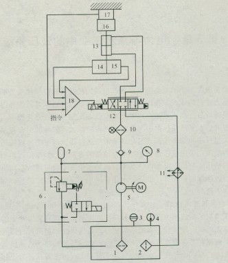 圖2-47所示為電液伺服控制系統(tǒng)的液壓原理圖。系統(tǒng)的油源為CY—C系列電機組合泵5,泵的工作壓力和卸荷由電磁溢流閥6設定和控制,壓力由壓力表8顯示。系統(tǒng)的執(zhí)行器為液壓缸13,通過電液伺服閥12的控制,液壓缸的活塞桿按要求方向和速度運動并帶動減振器1 6運動;伺服闊12前設有帶污染指示的精過濾器10。系統(tǒng)還設有液位計3、溫度調節(jié)器4、吸油和同油過濾器1及2、蓄能器7等輔助元件。該系統(tǒng)與微機測控系統(tǒng)一起對試驗臺進行閉環(huán)反饋控制。