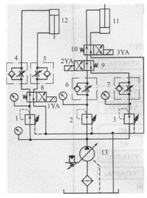 圖3 (a)所示為熱封機的液壓系統(tǒng)原理圖。系統(tǒng)的執(zhí)行器為驅動平臺升降的液壓缸11和驅動加熱板升降的液壓缸12,用以完成加熱和熱封時的保壓過程。系統(tǒng)的油源為限壓式變量泵13。缸11和缸12的運動方向分別由二位四通電磁換向閥10和8控制;為了在三個油路上獲得獨立的穩(wěn)定壓力,分別用三個減壓閥1、2、3對它們進行調壓,減壓閥1和2用于設定加熱時的壓力,減壓閥3用于設定熱封時的壓力,從而滿足不同工作階段對壓力的需求;缸11的快速上升和慢速接近運動分別采用單向節(jié)流閥6、7進油調速,并用換向閥9實現(xiàn)兩種速度的換接;由于加熱板行程較短,故采用單向節(jié)流閥4和5雙向出口節(jié)流。