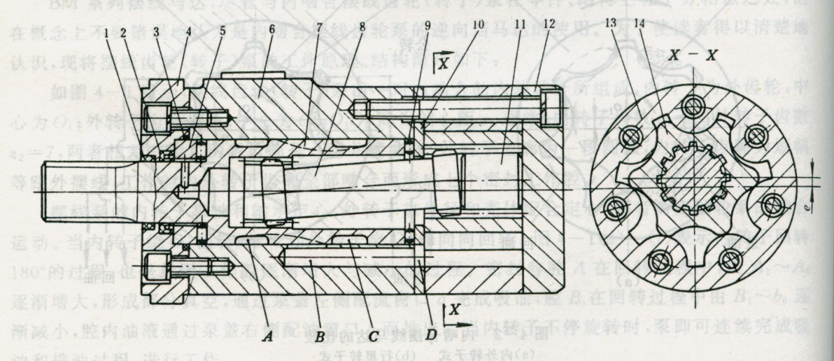 圖1為一種擺線馬達的典型結構,具有Z1個齒的擺線轉子(即外齒小齒輪)14,與具有z2個圓弧齒形的定子(即內齒環(huán))13之間有偏心距e,當兩輪的齒數(shù)差為1,即z2–z1=1時,兩輪所有的輪齒均能嚙合并形成如圖1中X-X剖面中(22=7,Zl=6)所示的z2(定子針齒數(shù))個獨立的容積變化的密封腔。配流軸(即輸出軸)7上的橫槽A、B與進出油口相通,在配流軸表面有相間均布的兩組縱向油槽共22i條,一組(Zl條)與A相通,另一組(Zl條)與B相通(見圖2)。在馬達的殼體6中有22個孔C,這些孔經過輔助配流板10的相應的22個孔D而分別與定子的齒底相通(即分別與22個密封容腔相通)。