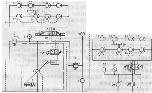1-比例變量液壓泵;2-變量缸;3-比例控制器;4-比例閥;5、8、21-溢流閥; 6、9、23-壓力表;7-控制液壓泵;10 -三位四通電液換向閥;11~18 -雙向定量液壓馬達(dá);19-齒輪;20-恒壓變量液壓泵;22-蓄能器;24-電液比例方向閥