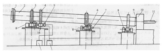 1-窯尾密封裝置2-回轉窯筒體3-輪帶4-傳動大齒圈5菠壓馬達6蒗壓擋輪