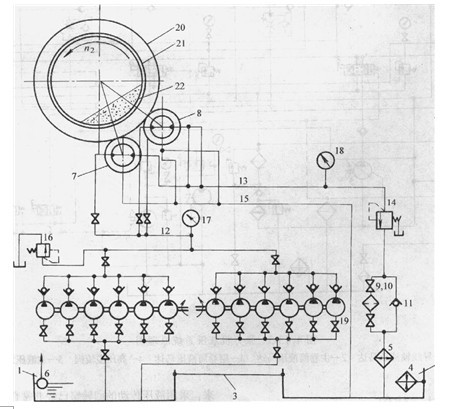 在液壓馬達的回油管13卜裝有背壓閥14,它除了可使液壓馬達運轉平穩(wěn)以外,還可以保護其定子內(nèi)表面不受柱塞端部滾輪的沖擊,以延長使用壽命。背壓應保證在0.15~1.OMPa之間。液壓馬達的泄油通過泄油管15直接回到沉淀油箱中,進行沉淀。為了防止系統(tǒng)過載損壞和監(jiān)視系統(tǒng)壓力,在泵的出口裝有安全閥16和壓力計17,起保護作用。在回油管路13上也裝有一塊壓力計18。