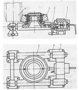 液壓擋輪的結構有許多種型式,但都大同小異。其結構如圖3所示。液壓缸1的活塞桿2推動擋輪3,擋輪與輪帶4的側斜面接觸,推動輪帶,輪帶帶動窯體上移。擋輪裝在具有兩個導向套筒的移動座5上,移動座沿導向軸6往復移動。液壓缸和擋輪都裝在支座7上。活塞左移靠液壓力推動,右移靠窯體下竄的作用力。為了確?;钊麠U2不別勁,其頭部加工成球面,可實現(xiàn)自動調(diào)心。