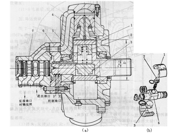 圖1所示的軸配流變量馬達的基本結構與定量馬達相同。不同之處是它的偏心值可以改變。為了實現(xiàn)這一目的,在集流器7和星形缸體4之間加進一個設有控制油口的隔套6,控制油從隔套經集流器引進曲軸5。曲軸上的偏心環(huán)1也不再與曲軸制成一體,而是做成分離的。偏心環(huán)中央是一條兩側平行的長槽,與方滑塊兩側面相配。方滑塊與馬達的輸出軸做成一體。方滑塊的另外兩面相對裝有大、小活塞3和2,在長槽里支撐著偏心環(huán)。大、小活塞腔分別與曲軸里的控制油路相連。當Y口進控制油(即小活塞腔進油、大活塞腔回油)時,小活塞在壓力油的作用下將偏心環(huán)1向最大偏心方向推動。當X口進控制油(即小活塞腔回油、大活塞腔進油)時,偏心環(huán)便向最小偏心方向推動。這樣就構成了復式排量馬達。