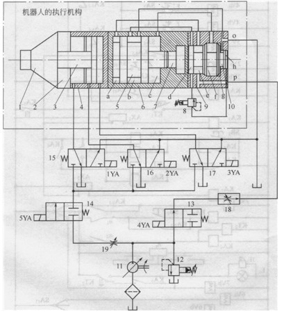 當機器人直線前進時,電磁鐵4YA、5YA均通電使換向閥13、14均切換至左位,液壓泵的壓力油同時進入沖擊和轉向兩個回路,使機器人的執(zhí)行機構同時實現沖擊和旋轉運動。