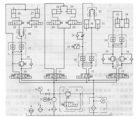 1)該機(jī)的液壓系統(tǒng)采用變量泵供油,液壓馬達(dá)和液壓缸回路分別控制和動(dòng)作,泵的流量和最高工作壓力按液壓缸的負(fù)載壓力和流量確定,液壓馬達(dá)的工作壓力通過減壓閥調(diào)節(jié)和保持恒定。系統(tǒng)等待期間,液壓泵可以卸荷,有利于減小功率損失和發(fā)熱。