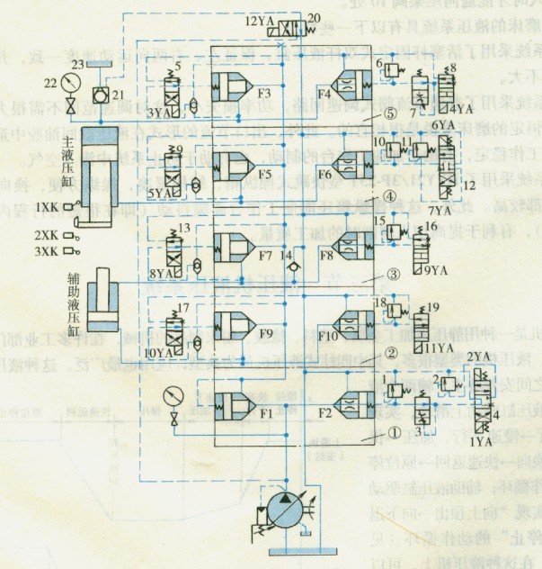 1、2、6、10. 11、15.18一調(diào)壓閥3、7一緩沖閥5、8、9、13. 16. 17. 19、20-二位四通電磁閥4、12-三L四通電磁閥14-單向閥21一液拄單向閩(充液闊) 22-電接點(diǎn)壓力表23-副油箱