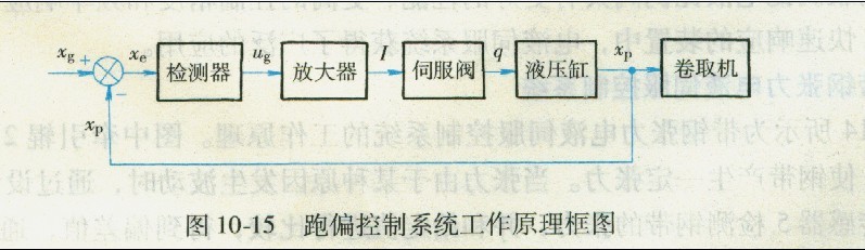 卷取機(jī)跑偏控制系統(tǒng)是邊緣位置控制系統(tǒng),其功能是使卷筒自動跟蹤帶鋼邊緣的跑偏,實現(xiàn)整卷鋼卷邊部的自動卷齊,卷齊精度在±1~ 2rmn。光電檢測器支架裝在卷取機(jī)移動部件上,屬于直接位置反饋(單位反饋),該跑偏控制系統(tǒng)工作原理框圖如圖10 -15所示。圖中Xg為帶鋼跑偏位移.XP為卷筒跟蹤位移,Xe為偏差位移口