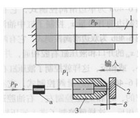圖6-42所示為噴嘴.擋板裝置的工作原理。它由噴嘴3、擋板2和液壓缸1組成。液壓泵來的壓力油p。一部分直接進入液壓缸1有桿腔,另一部分經(jīng)過固定節(jié)流孔a進入液壓缸1的無桿腔,并有一部分經(jīng)噴嘴一擋板間的間隙6流回油箱。當輸入信號使擋板2的位置(亦即是鰳改變時,噴嘴.擋板間的節(jié)流阻力發(fā)生變化,液壓缸1無桿腔的壓力p.亦發(fā)生變化,液壓缸1就產(chǎn)生相應的運動。