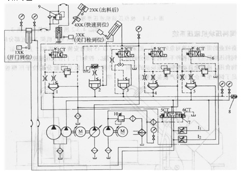 液壓系統(tǒng)原理如圖4.3-3所示。液壓控制系統(tǒng)主要由兩通插裝閥1~5電液閥7和電磁閥6組成。直動(dòng)式順序閥9及單向閥構(gòu)成門栓柱塞控制回路。10為直動(dòng)溢閥,8為壓力繼電器。