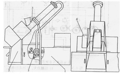 如圖4.3-2所示,該機(jī)由主機(jī)3、液壓站1、閥塊5、控制箱4和下機(jī)架2等五部分組成。主機(jī)3以45°傾角安裝于下機(jī)架2上。主缸(壓料缸)、門缸、控制門、門栓及壓模腔五大總成構(gòu)成主機(jī)工作機(jī)構(gòu)。主缸和門缸分別位于壓模腔的上下兩端。