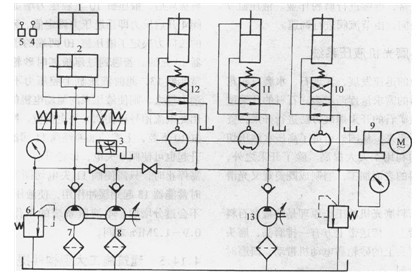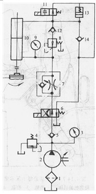 圖4為新型石料磨光機(jī)中的磨頭升降液壓系統(tǒng)。電動(dòng)機(jī)啟動(dòng)后,液壓泵2開始供油,電磁閥6得電后,油液進(jìn)入液壓缸10上腔,砂輪快速下行。因有閥8和閥7形成的背壓,下行速度不致過快,此時(shí)彈簧式蓄能器13放油。當(dāng)砂輪接觸石料板坯后,液壓缸10上腔壓力增加,當(dāng)達(dá)到溢流閥4開啟壓力即系統(tǒng)壓力調(diào)定值。砂輪作用于板坯的法向力決定了液壓缸10兩端的壓差。此時(shí)蓄能器13充油。若遇到過厚板坯時(shí)砂輪被頂起,因有蓄能器13,此時(shí)液壓缸上腔壓力不會(huì)猛增。如切削力過大,則使液壓泵的驅(qū)動(dòng)電機(jī)的電流過大,利用此電流信號(hào)可使閥6失電復(fù)位。則袖液進(jìn)入液壓缸10下腔,上腔的油液經(jīng)腳ll同油箱。欲使磨頭升起也可使閥6失電,砂輪升起。上升到某一位置需停止時(shí),只需使閥11失電切斷回油路即可,此時(shí)蓄能器13起到緩沖作用,使液壓缸10上腔壓力不會(huì)過分增加。本液壓系統(tǒng)的工作壓力需調(diào)定在0 9 -1.2MPa之間。