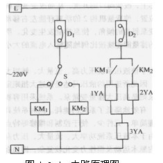 該液壓傳動系統(tǒng)由三個獨立的液壓站組成,每個液壓站對應(yīng)驅(qū)動一個液壓馬達,每個液壓馬達驅(qū)動一組鏈條,通過分別控制三組鏈條的進退速度來達到均勻進料的目的。現(xiàn)以其中一組液壓回路來說明其工作原理。液壓原理見圖4.2-3、電氣原理見圖4.2-4。