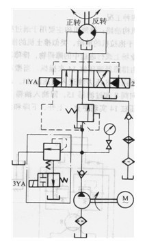 當電動機帶動液壓泵啟動后,開關(guān)S切向左側(cè)時,繼電器KM.觸點接通,電磁鐵3YA、1YA帶電,電液換向閥處于左位,順序閥在控制油的作用下導通,壓力油從油箱經(jīng)過濾器、液壓泵、單向閥、順序閥、換向閥至液壓馬達左側(cè)油口,推動馬達正轉(zhuǎn)。回油則從液壓馬達右側(cè)油口至換向閥、單向閥、冷卻器、過濾器、回到油箱;同樣,當開關(guān)S切向右側(cè)時,繼電器KM2觸點接通,電磁鐵2YA、3YA帶電,電液換向閥處于右位,壓力油進入液壓馬達的右側(cè)油口,推動馬達反轉(zhuǎn);當開關(guān)S切向中間位置時,電液換向閥處于中位,壓力油從換向閥的中位直接卸荷,馬達停止運轉(zhuǎn)。系統(tǒng)壓力由電磁溢流閥調(diào)節(jié),系統(tǒng)壓力值可以從壓力表中讀出。
