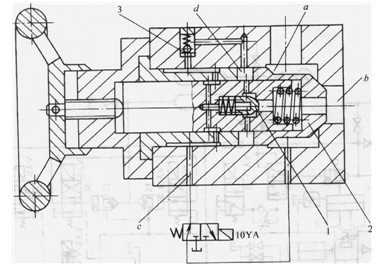 基于壓鑄成型下藝的特殊要求,壓射部分液壓管路的設(shè)計(jì)流速,一般可取25~30m/s,否則液壓管路和元件將變得十分龐大,使整個(gè)壓射機(jī)構(gòu)難于安排。蓄能器按絕熱狀態(tài)計(jì)算。方向閥要滿足快速啟動(dòng)和大流量的要求。第一級(jí)快速壓射閥34是普通插裝閥,第一級(jí)快速壓射閥是一種特殊結(jié)構(gòu)的插裝閥,它允許通過的壓力油的流量不低于4200L/min,具有快速啟動(dòng)和自動(dòng)關(guān)閉的性能,不需要大的先導(dǎo)閥控制,其結(jié)構(gòu)簡(jiǎn)圖見圖3。閥的a腔與壓射蓄能器22和31相通,b腔接壓射缸的無(wú)桿腔,當(dāng)先導(dǎo)電磁閥10YA動(dòng)作時(shí),c腔回油并向閥l左腔回油,其閥芯打開,d腔中的油流進(jìn)b腔。于是主閥芯2左移,使a腔接通,進(jìn)行快速壓射。快壓射結(jié)束時(shí),10YA斷電,壓力油進(jìn)入c腔,一路關(guān)閉單向閥,另一路經(jīng)單向閥3進(jìn)入d腔關(guān)閉主閥芯2。
