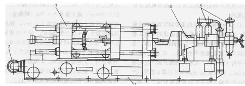 圖1為壓鑄機(jī)外型圖,圖中l(wèi)為床身,2為泵組件,3為合型機(jī)構(gòu),4為后射機(jī)構(gòu),5為高能器組件。機(jī)器由電器系統(tǒng)控制,由液壓系統(tǒng)完成所需的動(dòng)作。該機(jī)液壓系統(tǒng)見圖4.12-2。臺(tái)型缸1運(yùn)動(dòng)進(jìn)行合型,為了使較小的合型缸產(chǎn)生很大的合型推力,采用曲拐連桿擴(kuò)力機(jī)構(gòu)。合型過程是先低壓驅(qū)動(dòng)以保護(hù)壓鑄型,再進(jìn)行高壓閉鎖。當(dāng)合型到位后,插入型芯,此后一定量的金屬液澆人壓射室中,然后壓射缸2動(dòng)作進(jìn)行壓射,為了減少空氣的卷入,壓射開始階段用較低的速度,當(dāng)金屬液完全充滿壓射室及橫澆道時(shí),立即高速壓射以得到表面清晰的鑄件。為了得到致密的鑄件,在金屬液完全充滿型腔的瞬間,增壓器3立即作用,使金屬液馬上處于高壓下進(jìn)行凝固,此種高壓一直保持到規(guī)定的冷卻時(shí)間。這時(shí)進(jìn)行開型動(dòng)作,壓射頭同時(shí)跟出(如果開型前要先抽出型芯,則抽芯缸4或24動(dòng)作,抽芯后才能開型),開型到位后,頂出缸5推動(dòng)頂出板將鑄件由壓鑄型頂出。壓射活塞回程,頂出缸返回,開始準(zhǔn)備下次工作循環(huán)。為了保證鑄件質(zhì)量,蓄能器30的壓力必須達(dá)到規(guī)定值后,才允許進(jìn)行壓射動(dòng)作。另外,根據(jù)零件的結(jié)構(gòu),可采用多種插芯和抽芯程序,即先插芯后臺(tái)型或先合型后插芯,而抽芯與開型的順序則與插芯合型相反,機(jī)器的電器系統(tǒng)已備好程序選擇。