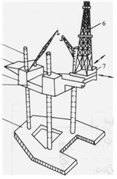 自升式海洋石油鉆井平臺外觀如圖4.9-3a所示。它主要由沉墊、平臺和樁腿三大部分組成。平臺上設有升降室3和井架底座7等。井架底座用以支承鉆機井架6,靠液壓缸來調(diào)整縱、橫向位置。在升降室中,如圖4.9-3b所示,液壓缸1、2、3用以完成插銷爬桿動作,使平臺作升降運動。