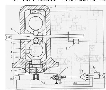 板坯料從旋轉著的上、下工作輥2所形成的輥縫中連續(xù)穿過,在軋制力的作用下板帶被軋薄,經多道次軋制后可達到所需成品的厚度。為了軋制薄板帶,工作輥2(與板帶直接接觸的軋輥)的直徑必須減小,但軋制力將使工作輥彎曲變形,為此,在工作輥上下兩側裝有大直徑的支承輥3以阻止工作輥變形。在軋制過程中對軋輥施以軋制力的機構稱為壓下裝置。被軋板帶l從上、下工作輥2所形成的初始輥縫中穿過。上、下兩組工作輥和支承輥3支持在上、下軸承座4上。上、下軸承座裝在前、后兩側機架5內(圖示為移去前側機架后的示意圖),上軸承座壓在測壓頭9上,下軸承座的位置由壓下液壓缸6控制。假如軋機的機架、軋輥、軸承座等傳力系統(tǒng)都是絕對剛體,那么由壓下液壓缸調定的初始輥縫值Su也就是軋制成品的厚度h。實際上由于被軋鋼板有很大的塑性變形,軋機傳力系統(tǒng)都是彈性體,因此,在初始輥縫給定條件下,板帶一經穿入,整個傳力的彈性系統(tǒng)就會變形使輥縫變大,成品厚度h也變大。此外,在軋制過程中由于板帶坯料厚度和材料變形抗力的變化以及傳力系統(tǒng)幾何形狀的變化(如軋輥的偏心)等因素的影響,也會使板帶成品厚度發(fā)生變化。為了軋制出等厚度的板帶,壓下液壓缸不僅應能調節(jié)空載時初始輥縫的大小,而且在軋制過程中其實際壓下量還必須隨時調整,以補償軋機傳力系統(tǒng)的彈性變化量(也稱為軋機的彈跳)的影響??梢?,板帶軋鋼機的液壓壓下系統(tǒng)是在軋制過程中保證板帶沿縱向能有等厚度的自動控制系統(tǒng)。壓下液壓缸6由電渡伺服閥7進行控制,壓下液壓缸的位移(反映初始輥縫的大?。┯晌灰苽鞲衅?/span>8檢測。軋機的彈跳量決定于軋制力的大小,為此在軋機的l軸承座上裝有測壓頭9,檢測軋制力的變化,考慮軋機剛度后即可感受出彈跳量的大小?;蛴脡毫鞲衅?/span>10測出壓下液壓缸前后壓差的變化,也可感受出彈跳量的大小。板帶出口的實際厚度h用測厚儀1l檢測。將位移傳感器、測厚儀、測壓頭(或壓力傳感器)經過剛度調節(jié)器13處理后的信號輸入伺服放大器12,其輸出送至電液伺服閥以完成板帶的等厚度控制。其控制方框圖如圖 2所示。測厚儀測得的出口板厚h與板厚給定值ho進行比較,產生厚度偏差調節(jié)量,考慮了在彈性傳力系統(tǒng)中板厚和輥縫之間的關系(用板厚一輥縫系數表示)后得到初