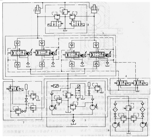 圖 3為板帶軋鋼機壓下裝置的液壓系統(tǒng)圖。圖中1、2分別為軋機前后兩側的壓下液壓缸。液壓缸無杠腔靠伺服單元3控制。每個壓下液壓缸由兩個并聯電液伺服蒯采用下述方式進行控制:在一個電液伺服閥的控制電路中加入△%的死區(qū);另一則無死區(qū),這樣,當控制信號小于死區(qū)范圍時只有一臺伺服閥工作,系統(tǒng)的增益較小容易穩(wěn)定;當控制信號大于死區(qū)范圍時兩臺伺服閥同時工作,系統(tǒng)增益較大有利于快速調節(jié)。轉換油路單元4可對四個電液伺服閥前后的八個液控單向閥進行操縱,可使電液伺服閥從系統(tǒng)中切除或投入。電液伺服閥由高壓油源單元5供油,單元中的蓄能器用以減少供油壓力的波動。高壓油源單元在正常工作情況下由低壓油源單元6供油,在單元中有精過濾器。由于高壓液壓泵吸入的是加壓后的精濾油,這樣就提高了工作可靠性和壽命。壓下液壓缸有桿腔是由回程油路單元7供油,正常工作時Ff低壓油路單元6直接供油,軋機的輥縫開啟時經減壓后供給較高壓力的液壓油。8為保護單元,對壓下液壓缸的有桿腔和無桿腔進行過載保護。