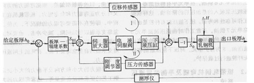 始輥縫的給定調節(jié)量So1。由伺服放大器、電液伺服閥、壓下液壓缸和位移傳感器所形成的位置控制閉環(huán)I使初始輥縫So的大小能跟蹤給定調節(jié)量Sol;由伺服放大器、電液伺服閥、壓下液壓缸和壓力傳感器、剛度調節(jié)器所形成的軋制力反饋閉環(huán)Ⅱ則使初始輥縫So1的給定值補償了對軋機的彈跳。軋機的初始輥縫So的大小也就決定了帶載軋機的出口板厚h。實際上影響出口板厚和初始輥縫之間關系的因素較多,如板帶進入軋機的厚度及變形抗力變化等因素,用干擾量△H加以考慮;軋輥的幾何偏心量用e加以考慮。在整個控制系統(tǒng)中只要設計合理就能滿足高速軋機等厚度控制的要求。