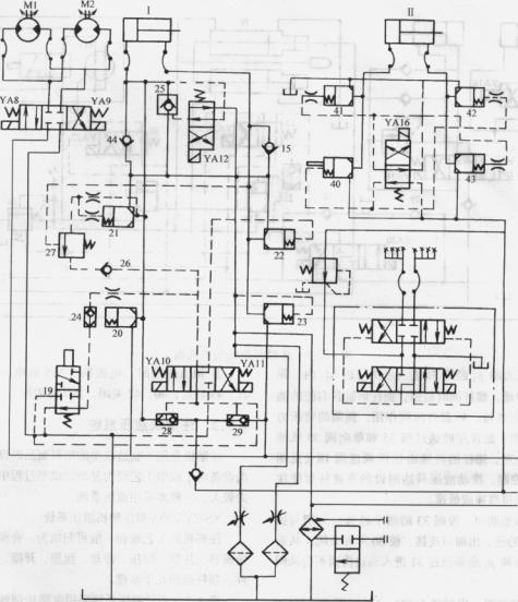 梭閥24的作用是與閥19、20組成安全聯(lián)鎖回路。只有安全門合上后,閥19復(fù)位,電磁鐵YA10通電時(shí),梭閥24的兩進(jìn)油口卸壓,閥20才可以打開,接通閉模進(jìn)油路。若安全門打開,20關(guān)閉,閉模中斷。