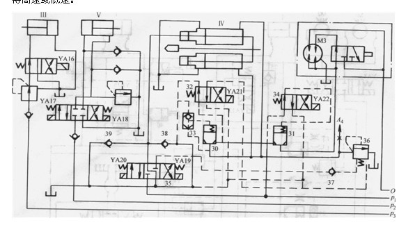 4)原始位置 在預(yù)塑、防流涎之后,YA19、YA20、YA21、YA22全部斷電,閥30、31關(guān)閉,閥38、37也被封閉,液壓缸Ⅳ左腔卸壓。