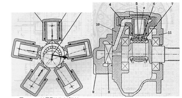 1-擺動(dòng)缸體;2-柱塞;3-曲軸,4-擺缸耳環(huán)軸;5-球面軸承套;6-滾柱;7-卡環(huán)f8一配流盤;9一配流器(通油盤);10-后殼體;11-前殼體