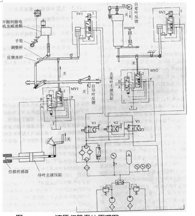 液壓控制系統(tǒng)原理圖如圖1所示。該系統(tǒng)可分為導(dǎo)葉和槳葉控制兩部分。二者在原理及結(jié)構(gòu)上大體相同,均由電液伺服加機(jī)液伺服系統(tǒng)組成。只是導(dǎo)葉伺服系統(tǒng)部分設(shè)置了餐急停機(jī)功能。