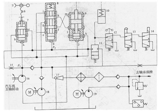 為了可靠地供給主機(jī)軸承潤滑而不受電源的影響,普遍采用主軸驅(qū)動的泵16來供給工作油,而潤滑油則通過射油器17降壓供給。只有在機(jī)組起動或出現(xiàn)事故時,才用手動或通過壓力開關(guān)自動開啟備用工作泵18或備用潤滑泵19。