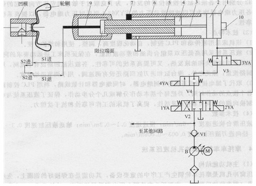 7一端蓋;8一壓窩頭9-沖針;l0-接近開關(guān);B-單向變量液壓泵;Vl-單向閥;