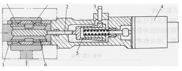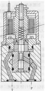 圖6-57所示為錐閥型高速開關(guān)電磁閥。當(dāng)線圈4通電時(shí),與閥心1為一體的鐵心2被固定元件3吸引而使閥開啟,油液由P口流人T口。為防止開啟時(shí)閥因穩(wěn)態(tài)液動(dòng)力而關(guān)閉和減小控制電磁力,該閥通過射流對(duì)鐵心的作用來補(bǔ)償液動(dòng)力。斷電時(shí)則由彈簧復(fù)位。該閥的行程為0. 3mm,動(dòng)作時(shí)間3ms,控制電流0.7A,額定流量12 L/min。