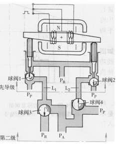圖6-56所示為用力矩馬達(dá)和球閥組成的高速開關(guān)型數(shù)字閥。力矩馬達(dá)某一線圈通電時(shí)如銜鐵順時(shí)針偏轉(zhuǎn),便推動(dòng)先導(dǎo)級(jí)球閥2向下運(yùn)動(dòng),關(guān)閉壓力油口P。。L:腔與回油P。接通,球閥4在液壓力作用下上升,PA腔與壓力油P。相通。而左邊的先導(dǎo)級(jí)球閥1壓在上邊位置,Li腔與壓力油通,球閥3向下關(guān)閉,PA腔與回油腔PR斷開。反之,當(dāng)另一線圈通電使銜鐵逆時(shí)針偏轉(zhuǎn)時(shí),情況剛好相反,PA腔與回油腔PR相通。這種閥的流量小,僅1.2L/min,工作壓力可達(dá)20MPa,最短切換時(shí)間0.8ms。