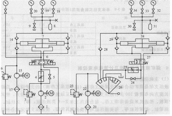 1 5、9、18、19、2024、30、32、33,34-截止閥;6-三位四通電磁換向閥;7、38-增壓器;8、31-蓄能穩(wěn)壓器;10、35-低壓壓力表;11、36-高壓壓力表;12、37一超高壓壓力表;13-油壓壓力表;14、28、29單向閥;26-二位四通手動(dòng)換向轉(zhuǎn)閥;27-二位四通電磁換向閥