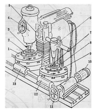 1、9-回轉(zhuǎn)臺;2一工件;3-銑刀;4-銑頭;5、11-手輪; 6 -隨動閥;7一觸頭;8-靠模;10 -電動機;12、13 -蝸桿 、