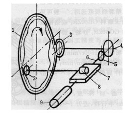 1-大齒輪及待加工導軌;2一刀具或磨頭;3-小齒輪;4-凸輪;5-靠輪; 6-頂桿;7-小拖板;8-電動機;9-液壓缸(或重塊)
