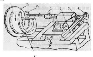 待加工導軌與大齒輪1(Z1、mi)緊固在車床花盤上,同步旋轉(zhuǎn),并驅(qū)動小齒輪3(Z2 -m2)。