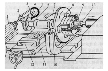 1-電動機;2、3-皮帶;4-蝸桿;5-蝸輪;6一軸;7一滑座; 8-靠模;9-工件;10-滾輪;11-拉簧;12 -座板;13-磨頭