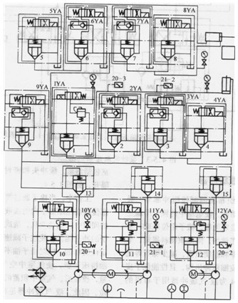 該液壓系統(tǒng)如圖4.6-1所示,用于將合成橡膠散料壓制成一定規(guī)格的橡膠塊。系統(tǒng)采用多泵并聯(lián)結(jié)構(gòu)。由于執(zhí)行機(jī)構(gòu)所需流量較大,故采用錐閥結(jié)構(gòu)作為控制元件。6YA、7YA、8YA帶電時(shí),水平擠壓缸差動(dòng)快進(jìn),6YA、8YA工作時(shí)完成擠壓動(dòng)作,SYA、7YA帶電,擠壓缸返回,頂出缸動(dòng)作由1、2、3、4、9錐閥進(jìn)行控制。