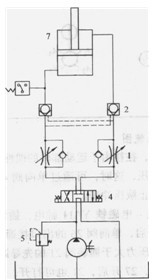 1- 單向節(jié)流閥2-液壓鎖3-壓力繼電器4-電磁換向閥5-溢流閥6-液壓泵7-液壓缸