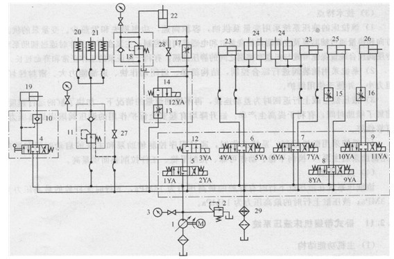 1-限壓式變量叫片泵;2一溢流閥;3一壓力表;4三位四通手動(dòng)換向閥; 5、6、7、8、9 -三位四通電磁換向閥;10-液控單向閥;11-減壓閥; 12、14-二位二通電磁換向閥;13、l5、16、17調(diào)速閥,18單向減壓閥; 19-鋸條張緊缸;20-導(dǎo)向機(jī)構(gòu)鎖緊缸;21鋸條導(dǎo)向缸;22一鋸架升降缸;z3夾緊缸(前后同); 24-頂起缸(前后同);25一前卸料缸;26后送料缸;27、28截止閣;29冷卻器