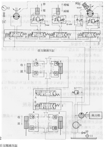 2多蹄閥3安全閥4-雙向被壓鎖5、6、8-平衡閥7-單向節(jié)流閥9-中心回轉(zhuǎn)接頭10-fl關11-過濾器12-壓力表
