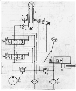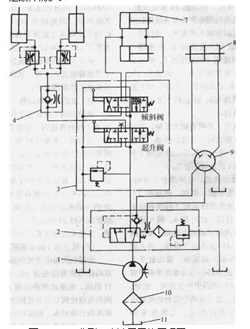 1-操作泵2一控制閥組3-升降液壓缸4單向節(jié)流閥5-傾斜液壓缸6-溢流閥7-回油過濾器8-轉(zhuǎn)向液壓泵9-轉(zhuǎn)向系統(tǒng)溢流閥10-助力液壓缸11轉(zhuǎn)向助力隨動(dòng)閥