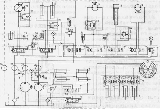 11–支臂伸縮缸12-副吊鉤吊起馬達(dá)14、29、30-單向節(jié)流閥15-副吊鉤制動(dòng)液壓缸16-液動(dòng)閥18、27、32、33-溢流閥19-變幅液壓缸21-主吊鉤馬達(dá)