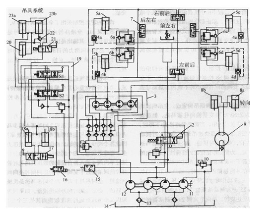 1-升降系統(tǒng)液壓泵2一升降換向閥3-同步馬達(dá)4-液控單向閥5a、5b一后左右升降缸6a、6b-右后、左后平衡閥7-微調(diào)同步閥8a、8h-轉(zhuǎn)向助力液壓缸9-轉(zhuǎn)向控制閥10-溢流閥11-轉(zhuǎn)向系統(tǒng)液壓泵12-吊具操縱液壓泵13過濾器14-油箱15-壓力繼電器16-浮動(dòng)控制閥17-吊具擺動(dòng)控制閥18a、18b-前后側(cè)移液壓缸19-側(cè)移轉(zhuǎn)鎖控制閥20-40ft (12.2m)吊具轉(zhuǎn)鎖液壓缸21-吊具轉(zhuǎn)換閥22一單向閥23a、23b-前后20ft (6.1m)吊具轉(zhuǎn)鎖液壓缸