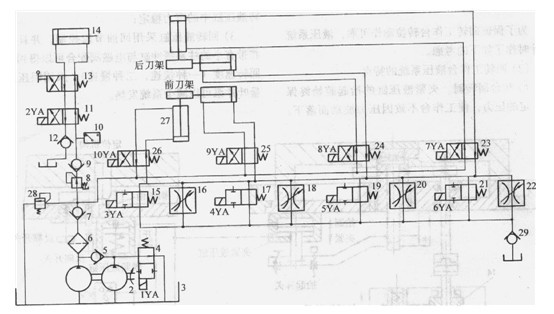 圖3示為雙泵供油系統(tǒng),低壓大流量泵2排油經(jīng)單向閥5與高壓小流量泵l排油匯合一處,經(jīng)過濾器6、單向閥7向系統(tǒng)各運(yùn)動(dòng)機(jī)構(gòu)提供壓力油,系統(tǒng)壓力由溢流閥28調(diào)定并保持。