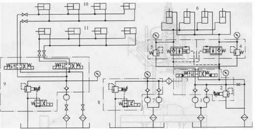 1-主回路雙定量液壓泵;2-溢流閥; 3-三位四通電液換向閥;4、5一限速、鎖緊閥組; 6-主液壓缸;7-控制回路雙定量液壓泵;8-控制閥組;9-插銷(xiāo)回路控制閥組; 10-上插銷(xiāo)液壓缸; 11-下插銷(xiāo)液壓缸