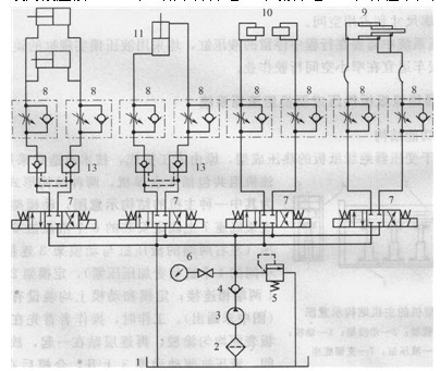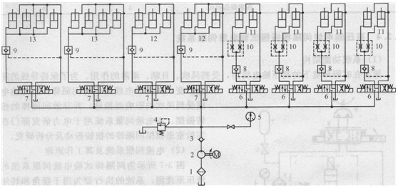 該機(jī)組的四臺(tái)單機(jī)共用一個(gè)液壓系統(tǒng)驅(qū)動(dòng),圖3-6所示為其液壓系統(tǒng)原理圖。系統(tǒng)的執(zhí)行器為22個(gè)液壓缸,右側(cè)的4組(每組2個(gè))液壓缸11分別用于驅(qū)動(dòng)各單機(jī)動(dòng)模的升降,每組缸的油路上設(shè)置的三位四通電磁換向閥6用于控制缸的升降方向,分流集流閥10用于兩個(gè)液壓缸的同步控制,液控單向閥8用于液壓缸的鎖緊;左側(cè)的兩組(每組4個(gè))液壓缸13和中間的兩組(每組3個(gè))液壓缸12分別用于完成各單機(jī)的壓緊保壓作業(yè),每組液壓缸的運(yùn)動(dòng)方向由互位四通電磁換向閥7控制,液控單向閾9用于保壓控制。系統(tǒng)的油源為定量液壓泵2,其供油壓力由溢流閥4設(shè)定,單向閥3用于防止液壓油倒灌。